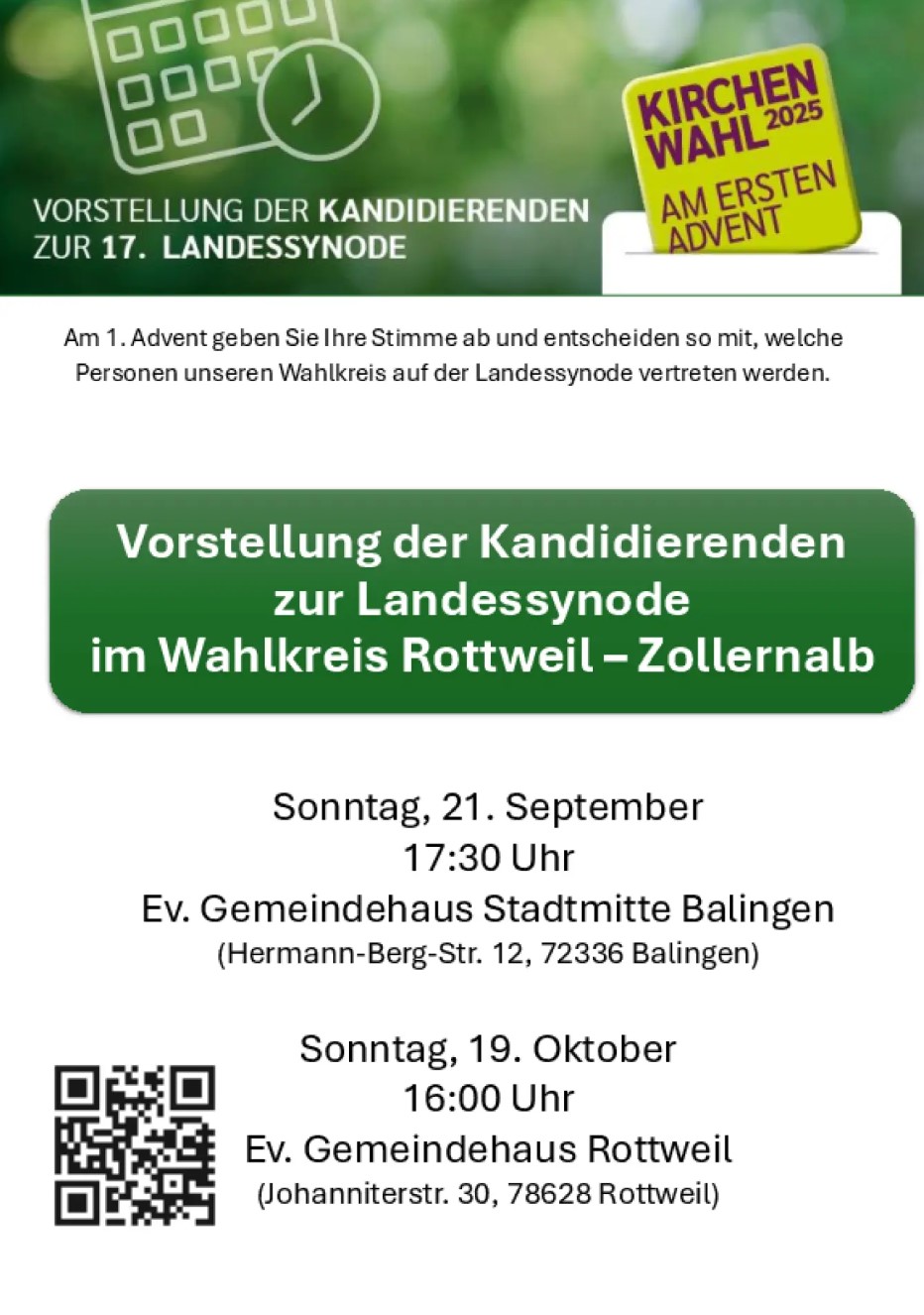 Vorstellung der Kandidierenden der Landessynode am 19. Oktober 2025 um 16 Uhr in Rottweil Zeige grösseres Bild Von oliverhelmers|2025-10-07T20:11:32+02:0007. Oktober 2025|Gemeinde aktuell|0 Kommentare Hinterlasse einen Kommentar Antworten abbrechenKommentar Meinen Namen, E-Mail und Website in diesem Browser speichern, bis ich wieder kommentiere.