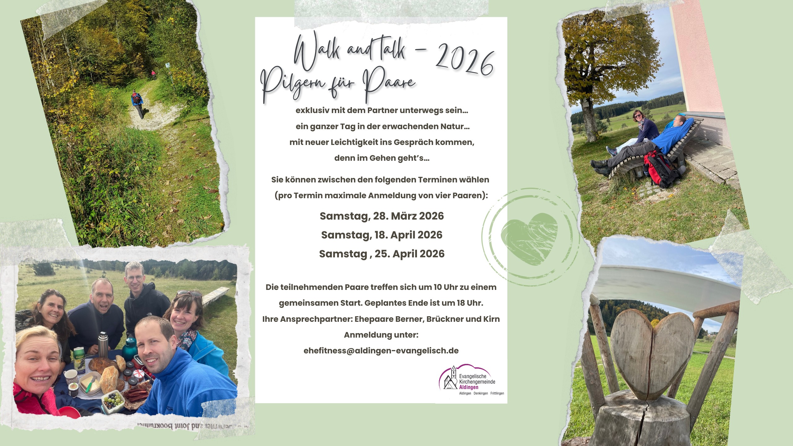„Denn im Gehen geht’s…“ – unter diesem inspirierenden Motto laden wir auch in diesem Jahr wieder alle Paare unserer Gemeinde und darüber hinaus zu einem ganz besonderen Erlebnis ein. Fernab vom Alltagstrubel und der To-do-Liste zu Hause schaffen wir Raum für das, was im Trubel oft zu kurz kommt: Zeit zu zweit, gute Gespräche und die Begegnung mit Gott in der Natur.